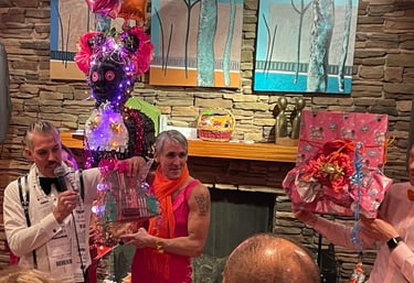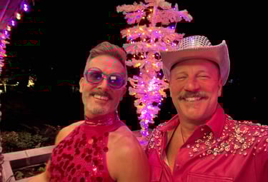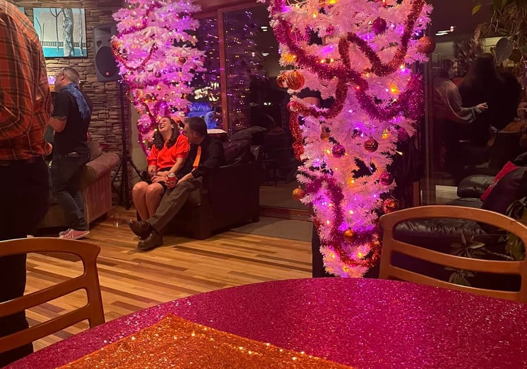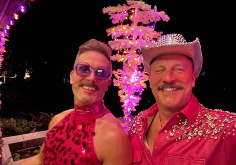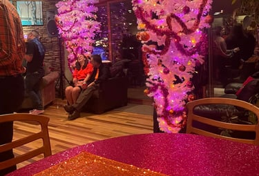 Pink and orange lights, upside-down holiday trees, and white garland are the primary decor. The more sparkles, the better.